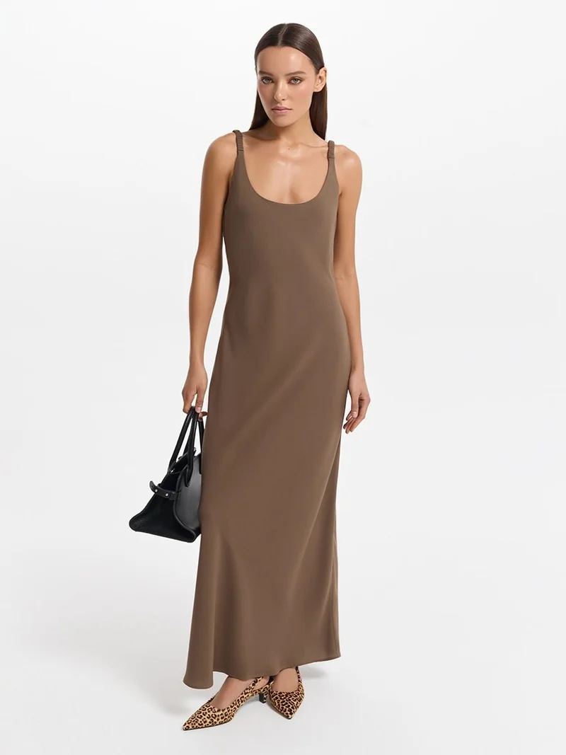Минималистичное платье макси цвета капучино прекрасно подойдет для завтрака с подругами — не забудьте заказать кофе с молоком в тон платью.