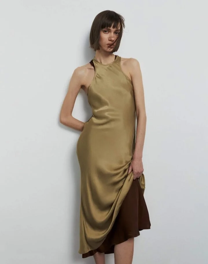 Платье из золотого сатина будет особенно уместно смотреться на морском побережье, но прекрасно впишется и в городские джунгли.