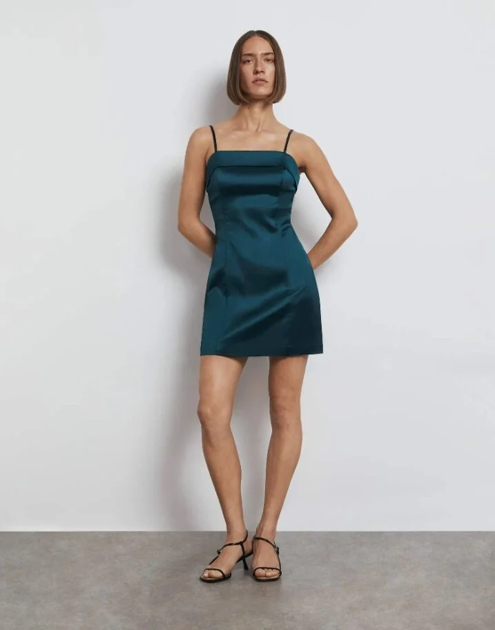 Темно-зеленое мини-платье будет незаменимым для летних вечеринок под открытым небом.