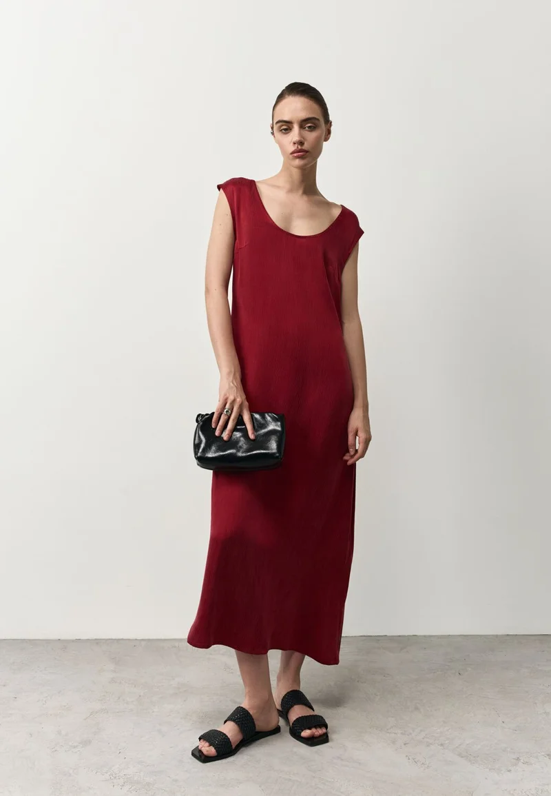 Платье в винном оттенке с глубоким вырезом создаст расслабленный вечерний образ.