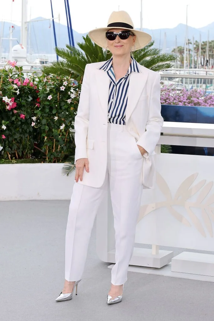 Классический, но всегда стильный дуэт — прямые белые джинсы и полосатая рубашка. Этот образ выглядит одновременно элегантно и непринужденно. Чтобы быть готовой к возможным вечерним похолоданиям, рекомендуется держать под рукой легкий джемпер, который можно будет накинуть на плечи.