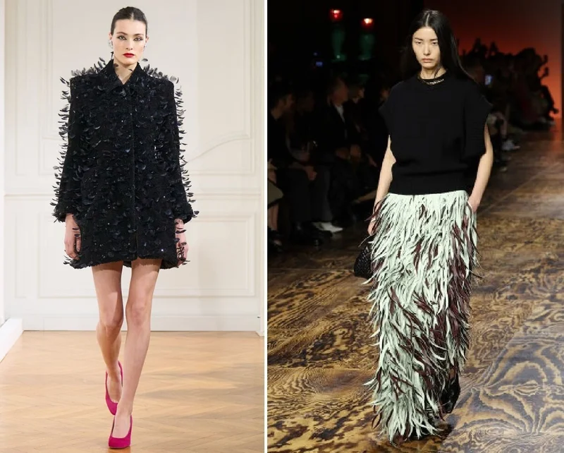 Украшения из перьев, которые когда-то указывали на высокий социальный статус, придают одежде особый драматизм. Осенью 2024 перья в моде повсеместны и даже для ежедневного обихода. Они украсили линии низа и вырезы на моделях Ferragamo и Bottega Veneta. В коллекции Tory Burch полно пуховиков, а у Brunello Cucinelli юбки с перьями в небрежном стиле выглядывали из-под свитеров.
