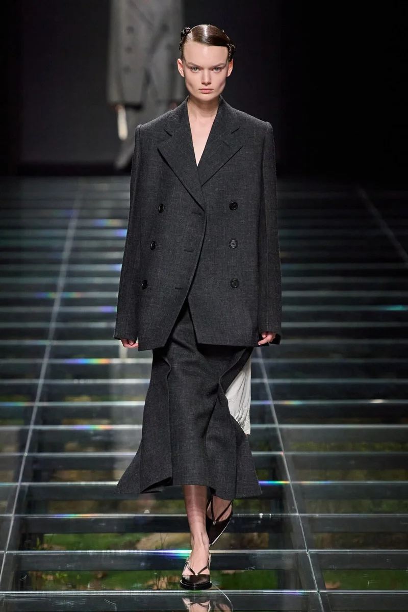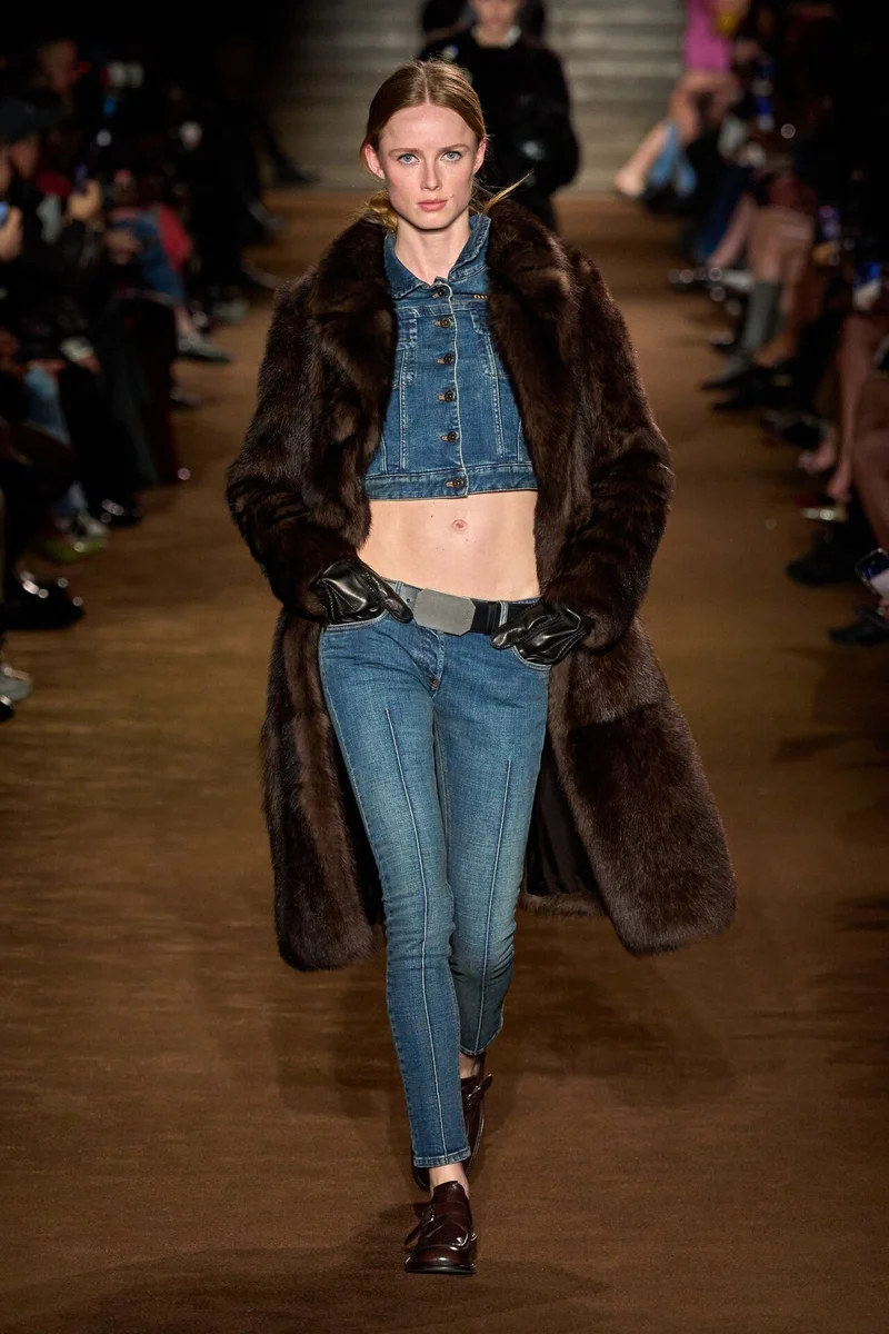 Миучча Прада показала свою версию джинсового костюма - укороченной куртки и брюк скинни. Женственный полушубок из искусственного меха добавил совершенный и неожиданный акцент.