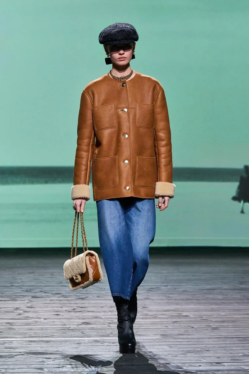 Chanel показал совершенный осенний образ: средней подваренности джинсы, коричневую замшевую куртку и чёрные сапоги из гладкой кожи.